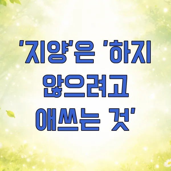 📌 포인트: '지양'은 '~하지 않으려고 한다', '~하는 것을 멀리한다'는 뉘앙스로 기억하세요. 마치 어떤 행동이나 상태에 '제동'을 거는 느낌이죠. 만약 어떤 행동을 '피하고 싶다', '멀리하고 싶다'는 생각이 든다면 '지양'을 떠올리면 거의 맞습니다.