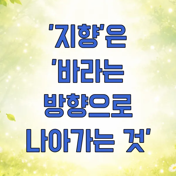 💡 핵심: '지향'은 '~을 목표로 한다', '~을 추구한다', '~쪽으로 향한다'는 뉘앙스로 이해하는 것이 좋습니다. 마치 어떤 목적지를 향해 '전진'하는 느낌과 비슷하죠. '~을 하고 싶다', '~을 이루고 싶다'는 마음이 있다면 '지향'이 적절합니다.